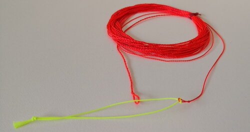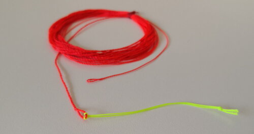 Bei windigen Verhältnissen oder wenn ich dynamischer Werfen muss (Weite !), dann schlaufe ich die geflochtene Line verkehrt herum ein und ich habe so eine Keulen-Schnur.
