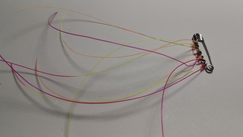 2) Dann fädle ich die so mit Monofil versehenen Vorfachringerl auf eine Sicherheitsnadel.