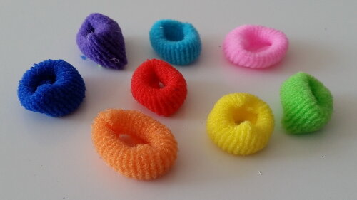Diese Frottee-Haargummis haben sehr kräftige leuchtende Farben und sind dadurch gut erkennbar, wenn so ein Haargummi als Farbkennung über die Vorfachspule gezogen ist.