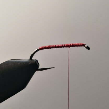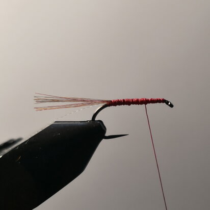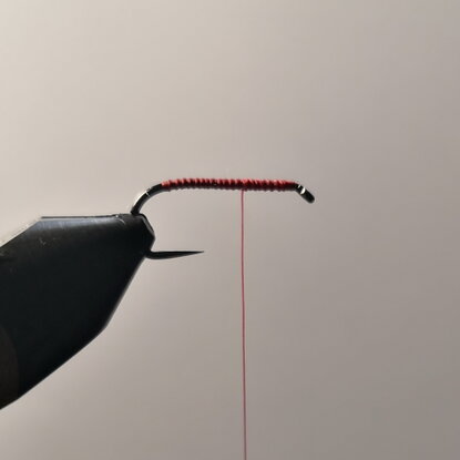 Schwänzchen einbinden und den Bindefaden wieder Richtung Hakenöhr führen.