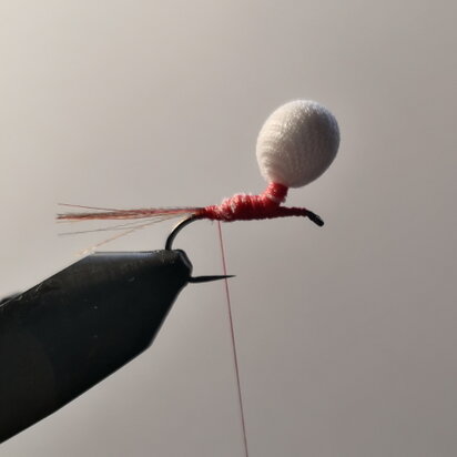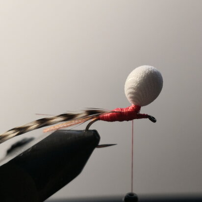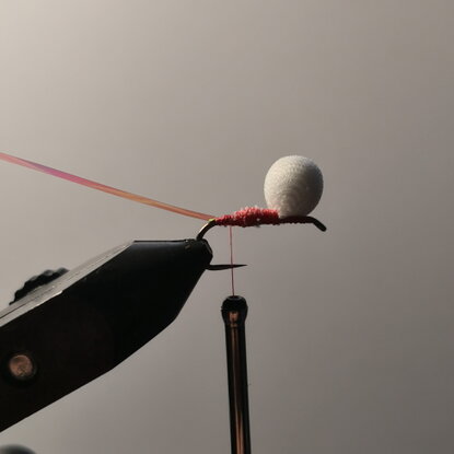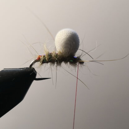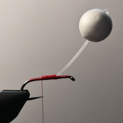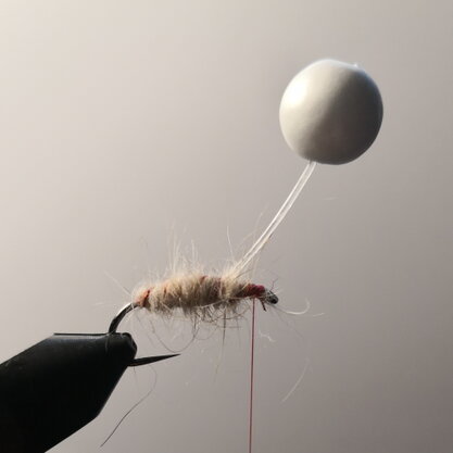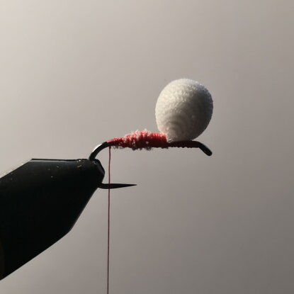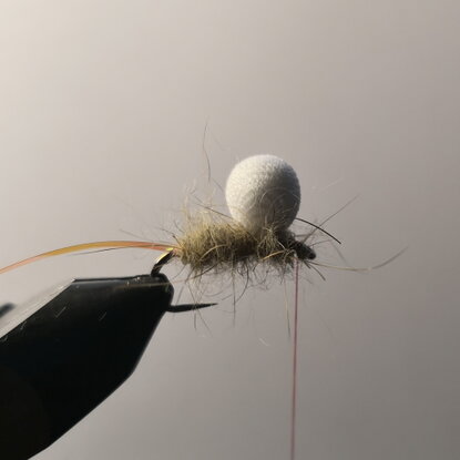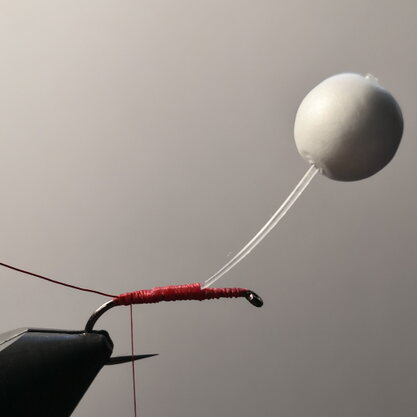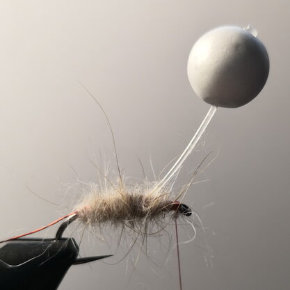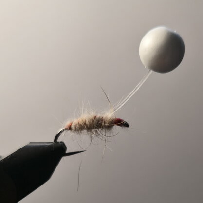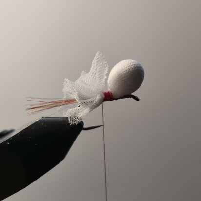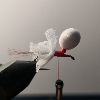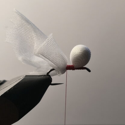 Ein Styropor-Kügelchen (der Durchmesser des Kügelchens entspricht etwa der Weite des Hakenbogens in ein Stückchen weißen Nylonstrumpf straff einhüllen und so einbinden, dass die vordere Rundung des Kügelchens etwas Freiraum zum Hakenöhr lässt und mit dem Bindefaden eine Grundwicklung rund um den Stumpf legen, sodass später eine Trockenfliegenhechel im Klinkhamer-Style (horizontal) eingebunden werden kann.