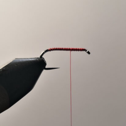 Tinselfaden kurz vor dem Hakenbogen fixieren (einbinden).