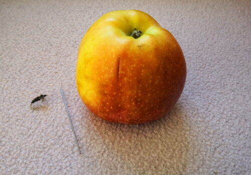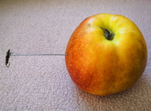 Steck nun das Spitzenende der Nähnadel in die Fliege und die andere Seite der Nähnadel in das Obst.