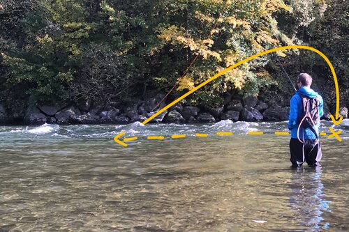 Man wirft die Fliege stromauf, lässt sie ganz natürlich abwärts, auf den Fliegenfischer zutreiben, holt dabei die Schnur entweder in Schlaufen ein oder lässt sie einfach ins Wasser fallen. Ist die Fliege auf der Höhe des Fliegenfischers angekommen, erfolgt der neue Wurf.
